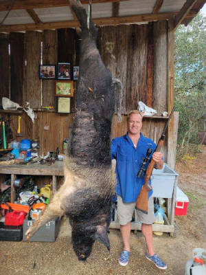 boar hog weighing 375 pounds, went into the shooting house where Sue was sitting